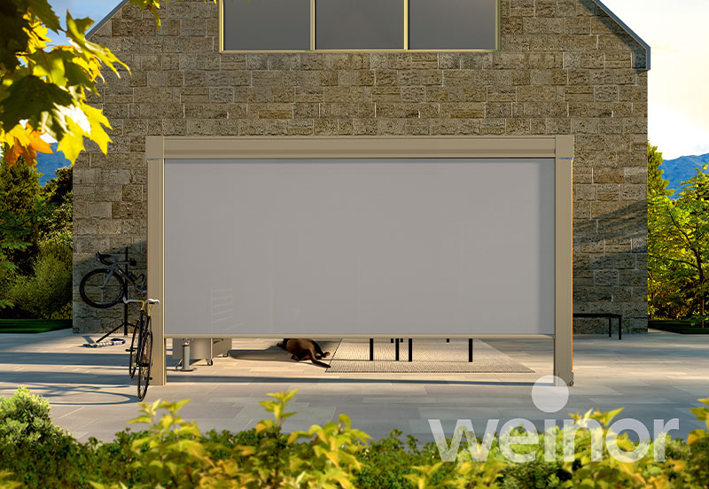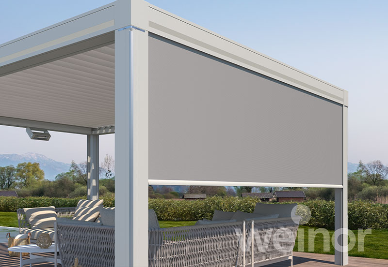 Für noch mehr Wetterschutz kann Ihr Lamellendach auf Wunsch mit Senkrechtmarkisen an den Seiten ausgestattet werden. Sie bieten Sicht-, Sonnen-, Wind- und Blendschutz in einem und lassen sich vollständig in die Dachkonstruktion integrieren. Ein patentiertes System sorgt für straffen Tuchstand in jeder Position.